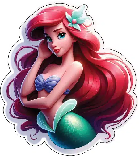 This printed vinyl decal brings to life Ariel’s enchanting world, where colorful coral reefs and playful sea creatures set the stage for her adventures. It features her iconic pose, surrounded by elements of the underwater kingdom that fans know and love. From her flowing mermaid tail to the dreamy sparkle in her eyes, every detail evokes nostalgia for this timeless animated masterpiece.