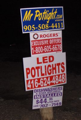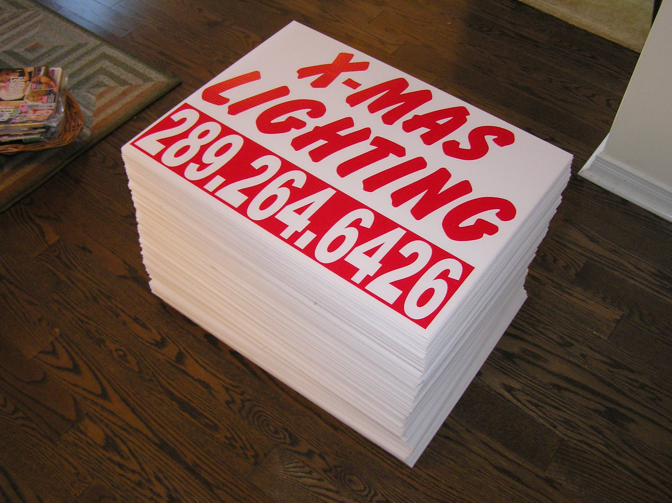 Screen printed coroplast signs are usually used as post signs. Thin metal wire is used to make two holes in the sign, and wrap around a traffic pole, electrical wire pole or a lamp-post. Alternatively, two holes are made and zip ties are used to secure the sign to the post. Post signs are usually smaller than bag signs, or lawn coroplast signs, however they are much more cost-effective, since they only need one side printed, and don’t require frames. They can also be placed at eye-level, making them more noticeable, and in spots where there is concrete and a lawn sign can’t be inserted. They are also great to use during the Canadian winter – as the ground becomes as tough as concrete, with snow covering lawns, a pole coroplast sign can still be placed up to advertise your business in time for the Holiday rush!