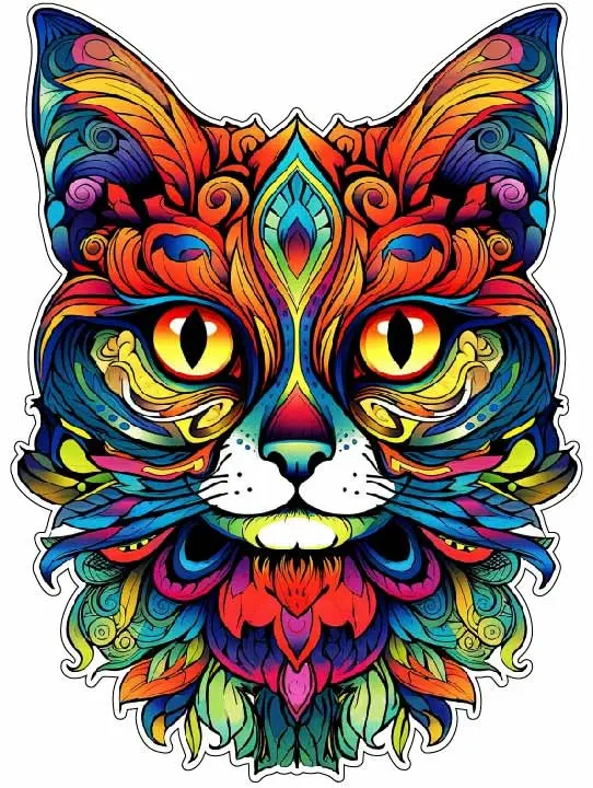 Now captured in this Fancy Cat Psychedelic Rainbow Kitty Colorful vibrant vinyl sticker, the spirit of this mystical feline can journey with you. Place it on your laptop, your journal, or your favorite travel companion, and let it serve as a small portal—a reminder that even in the ordinary world, there are hidden layers of color, elegance, and imagination waiting to be discovered.