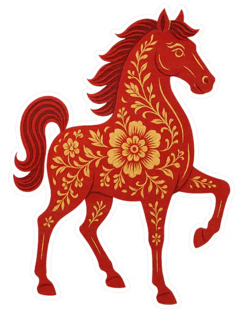 This red horse and flower design mixes power and beauty in a simple, eye-catching way. The horse stands for freedom, energy, and strength, while the flowers add a soft, calm feeling. Together, they create a design that looks bold and elegant at the same time.