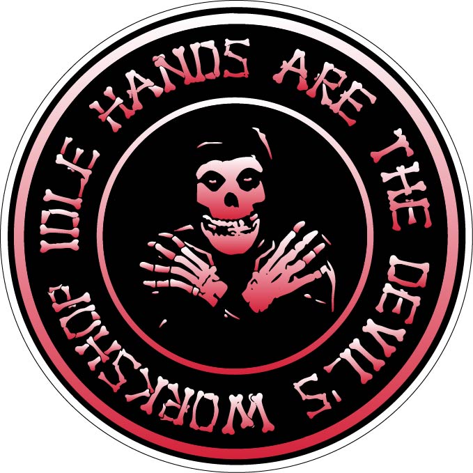 The skull at the center stares outward with an unsettling calm, as if aware of secrets whispered in the dark. Surrounding it, the circular inscription creates a ritualistic aura—like an ancient warning etched into forbidden scripture. The phrase “Idle Hands Are the Devil’s Workshop” carries an eerie psychological weight, suggesting that darkness thrives in silence, waiting for moments of stillness to creep into the mind.
