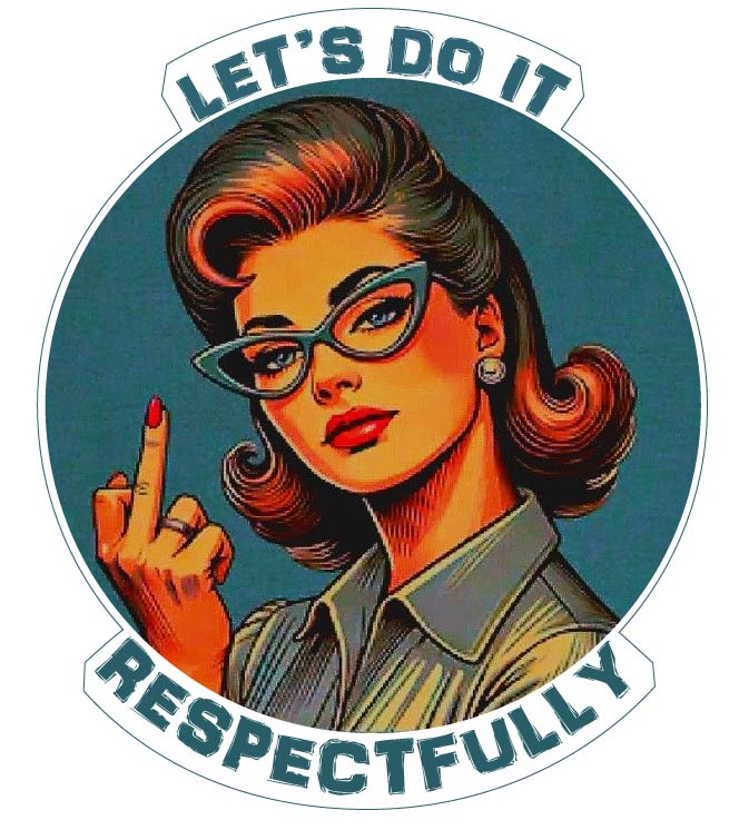 Turn heads and spark conversations with this unapologetically bold Let’s Do It Respectfully retro sticker—where vintage charm meets modern attitude. Inspired by the iconic 1950s pin-up aesthetic, this design delivers a striking blend of elegance, rebellion, and razor-sharp humor. At first glance, it radiates classic beauty—perfect hair, cat-eye glasses, and timeless style—but look closer, and the message flips the script entirely.