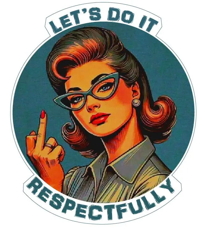 Turn heads and spark conversations with this unapologetically bold “Let’s Do It Respectfully” retro sticker—where vintage charm meets modern attitude. Inspired by the iconic 1950s pin-up aesthetic, this design delivers a striking blend of elegance, rebellion, and razor-sharp humor. At first glance, it radiates classic beauty—perfect hair, cat-eye glasses, and timeless style—but look closer, and the message flips the script entirely.