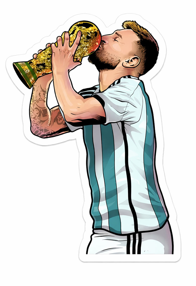 The artwork beautifully portrays Messi in his iconic Argentina jersey, holding the golden trophy with pride and emotion. The illustration style combines bold lines, vibrant colors, and clean detailing to create a powerful visual that instantly resonates with football lovers. It’s more than just a sticker — it’s a tribute to the greatest player of a generation and a celebration of one of the most dramatic finals in football history.