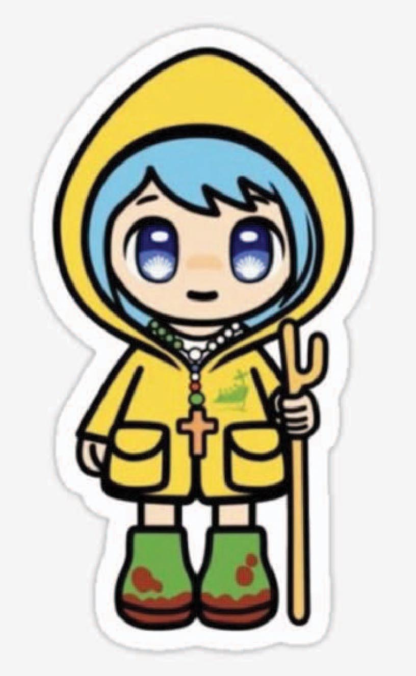In this charming chibi-style design, Luce stands ready for a journey that stretches far beyond city streets and ancient stone churches. Wrapped in a bright yellow raincoat like a traveler prepared for every storm, Luce represents the pilgrim spirit — the believer who walks forward even when the path is uncertain. The raincoat is not just clothing; it’s a symbol of protection and resilience. Storms may come, doubts may rise, but faith lights the way forward.
