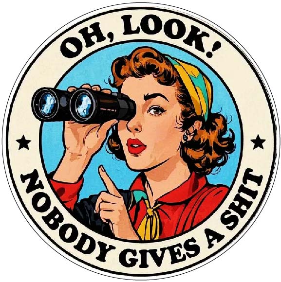 Inspired by classic retro pin-up aesthetics, this design features a bold, confident woman who’s clearly seen it all—and is completely over it. With her binoculars in hand, she scans the horizon, searching far and wide… only to confirm exactly what she suspected: absolutely nobody cares. It’s sarcasm at its finest, delivered with a wink, a smirk, and a timeless comic-style flair that feels straight out of mid-century pop art posters.
