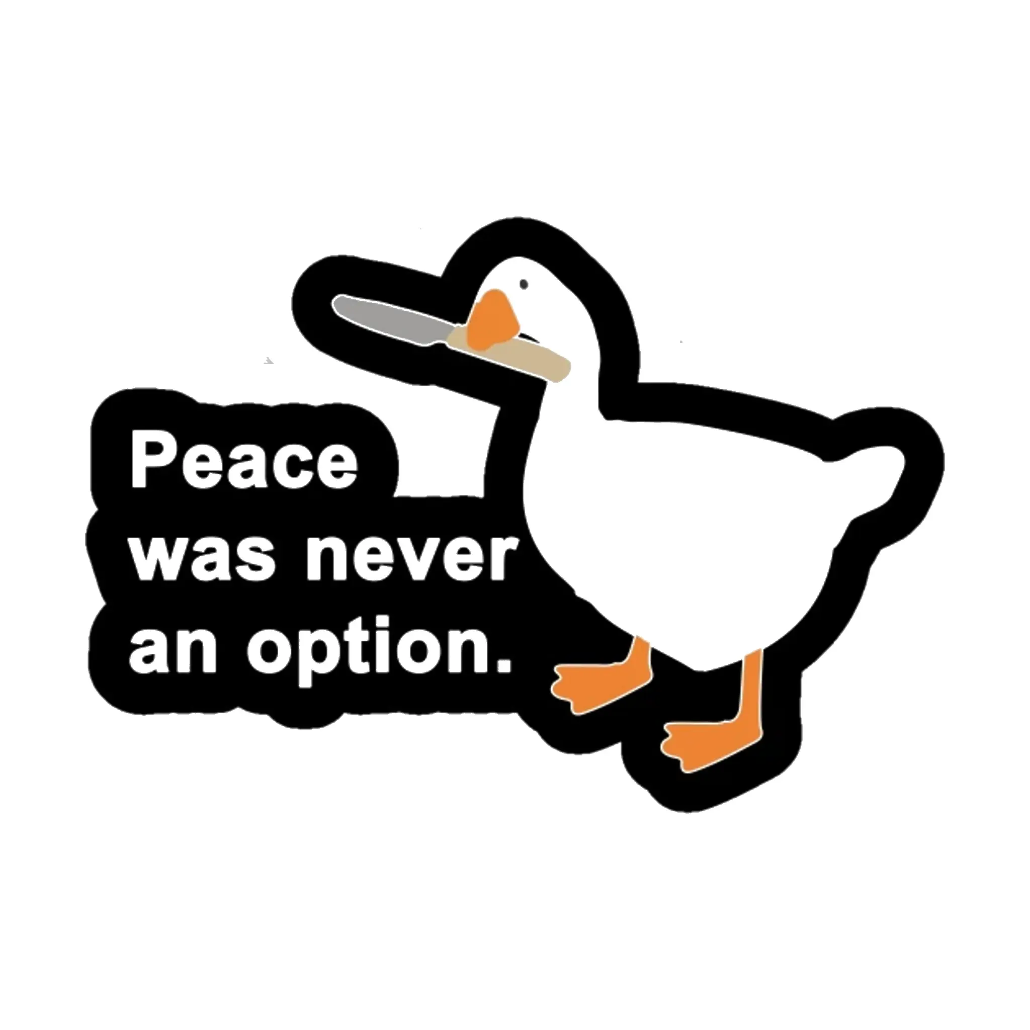 In the quiet corners of the internet, where memes are born and legends quietly sharpen their blades, one creature rose above them all — a simple goose who refused to play by the rules. This “Peace Was Never An Option” Goose With Knife Vinyl Sticker captures the chaotic spirit of one of the most iconic internet meme moments ever created. It’s funny, rebellious, slightly unhinged, and absolutely unforgettable.
