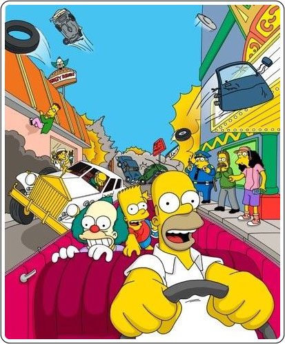 Front and center is Homer, gripping the wheel with heroic confidence and zero awareness, charging headfirst into a city that clearly regrets giving him a driver’s license. Behind him, panic unfolds in classic Simpsons fashion—sirens blare, characters scatter, objects fly, and logic exits the scene entirely. It is hit-and-run humor at its finest, exaggerated to glorious extremes, where every second feels like a punchline racing toward impact.