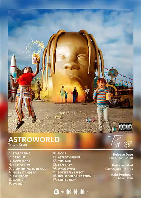 The poster itself showcases vibrant colors, trippy visuals, and iconic imagery from the album cover—a giant golden head of Travis Scott, inviting you into a world where reality blurs with fantasy. The surreal visuals reflect the album’s themes of escapism, ambition, and the quest for freedom, resonating deeply with fans who see themselves navigating through their own dreamlike journeys in life. It’s more than just an image; it’s a portal into a world where creativity reigns supreme, where music transcends boundaries, and where fans become part of something bigger than themselves.